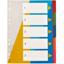 * wykonane z ekologicznego polipropylenu o grubości 120µm * ilość przekładek: 5 * indeks: 1-5 * dziurkowanie: 11 * format: A4 * rozmiar przekładki: 230x297mm * każdy komplet osobno pakowany w folię * mix kolorów