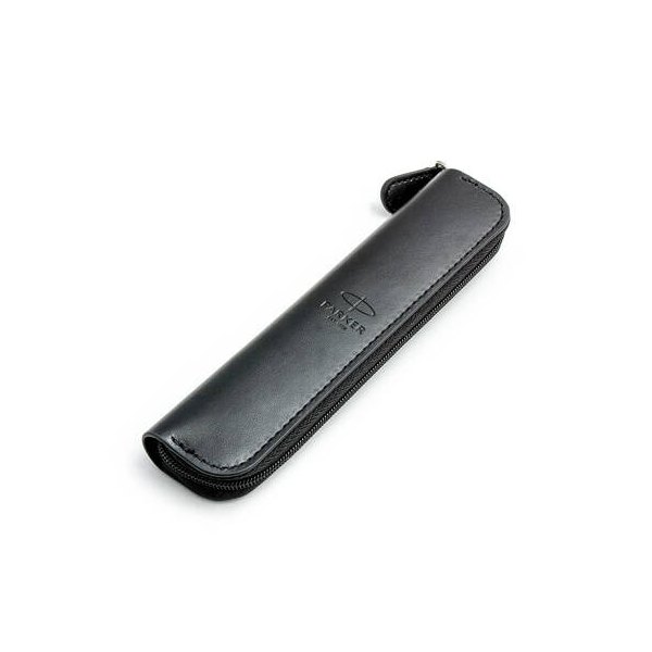 Oryginalne etui Parker w kolorze czarnym, wykonane z ekologicznej skóry. Zapinane na zamek. W środku miejsce na jeden produkt piśmienniczy. Na zewnątrz wytłoczony logotyp Parker.