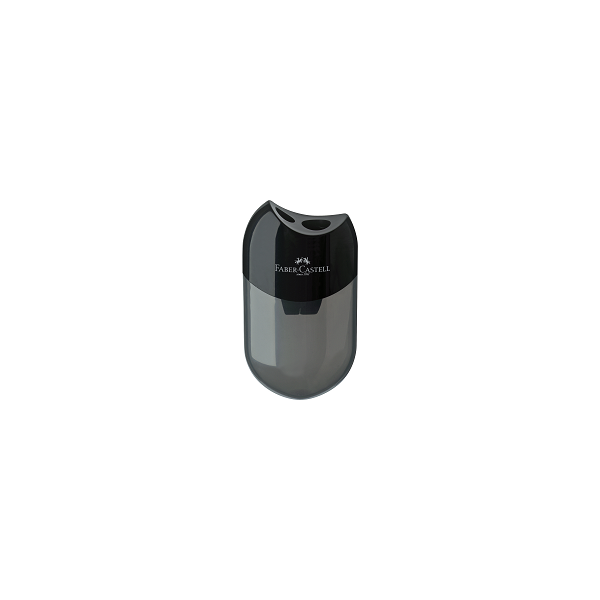 Temperówka podwójna owalna Faber-Castell w kolorze czarnym z pojemnikiem na ostrużyny.