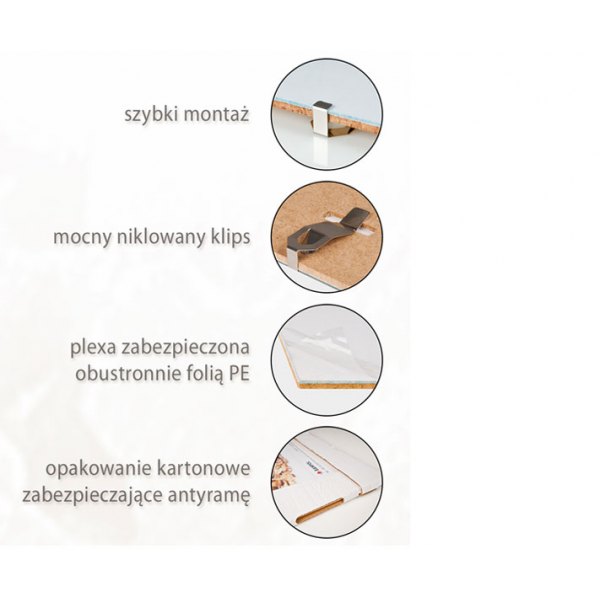 plexa i płyta MDF połączone metalowymi klipsami
