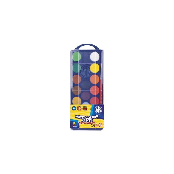 Farby akwarelowe to farby wodne służące do malowania na papierze. Mają one postać suchych guziczków, z których po zwilżeniu wodą niemal natychmiast uzyskuje się gotowe do użycia farby. Akwarele ASTRA składają się z wysokiej jakości drobno roztartych pigmentów, połączonych rozpuszczalnym w wodzie spoiwem.Oprócz pigmentów i spoiw akwarele zawierają wypełniacze, które sprawiają, że farba wysychając matowieje. Dzięki temu nakładając farbę grubiej można malować technikami zbliżonymi do gwaszu, a w większych rozcieńczeniach technikami charakterystycznymi dla akwareli. Akwarele można wykorzystywać w technikach łączenia z farbami temperowymi, plakatowymi i kredkami woskowymi ASTRA.