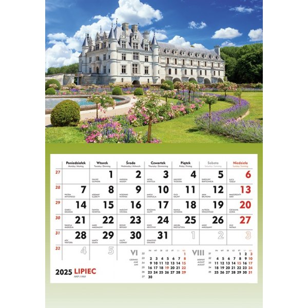Główka pełnokolorowa, okienko przesuwane, nazwy miesięcy i tygodni w wersjach językowych, miejsce na nadruk reklamowy.
