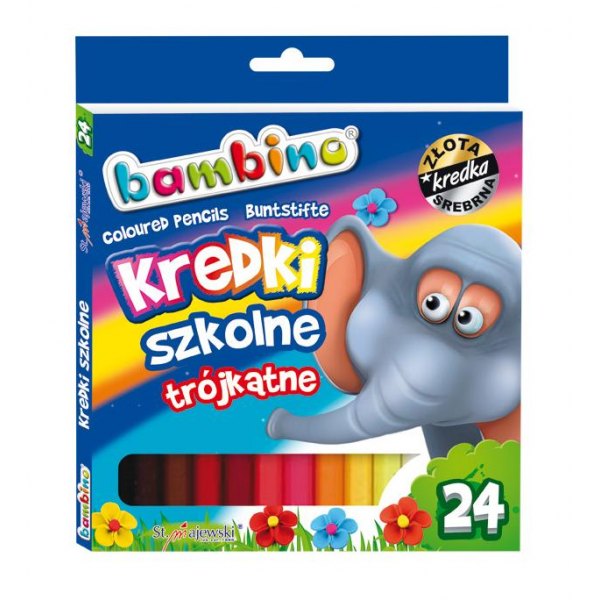 Ergonomiczne kredki ołówkowe o trójkątnym przekroju. Idealnie dopasowują się do małej dłoni dziecka. Bogata gama 24 kolory, w tym kredka złota i srebrna. Kredki szkolne wyróżnia wysoka jakość. Opakowanie tekturowe.