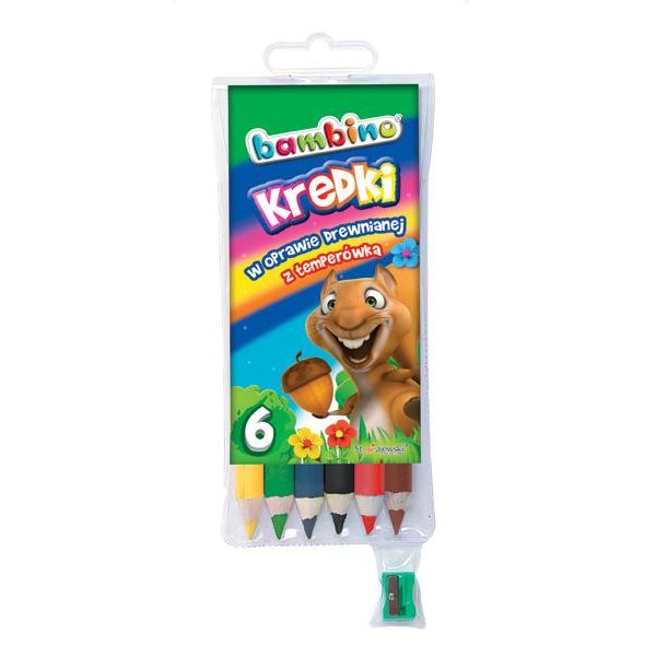 Wysokiej jakości kredki z glinki kaolinowej w drewnianej oprawie. Charakteryzują się wyjątkowo intensywnymi i nasyconymi kolorami. Doskonale kryją, idealnie nadają się do rysowania, wypełniania dużych powierzchni i wykonywania miękkich przejść pomiędzy kolorami. Kredki są grube, odpowiednio wyważone, przez co idealnie dopasowują się do małej dłoni dziecka. Produkowane są w Polsce, w zgodności z dyrektywą Parlamentu Europejskiego i Rady w sprawie bezpieczeństwa zabawek oraz rozporządzeniem Ministerstwa Gospodarki w sprawie zasadniczych wymagań dla zabawek, co gwarantuje bezpieczeństwo kredek Bambino. Opakowanie foliowe mix 6 kolorów + temperówka.
