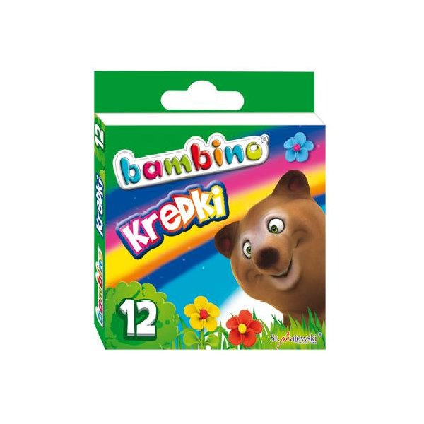 Wysokiej jakości kredki, które towarzyszą dzieciom od pokoleń. Wyróżniają je wyjątkowo intensywne i nasycone kolory oraz doskonale krycie powierzchni. Idealnie nadają się do rysowania, wypełniania dużych płaszczyzn i wykonywania miękkich przejść pomiędzy kolorami. Kredki Bambino wykonane są z glinki kaolinowej, co nieporównywalnie podnosi ich walory użytkowe względem kredek świecowych, woskowych czy ołówkowych. Każda kredka posiada papierową ochronną owijkę z własną grafiką (na każdej kredce inne zwierzątko). Kredki Bambino są bezpieczne dla dzieci, ich produkcja odbywa się w Polsce, w zgodności z dyrektywą Parlamentu Europejskiego i Rady w sprawie bezpieczeństwa zabawek oraz rozporządzeniem Ministerstwa Gospodarki w sprawie zasadniczych wymagań dla zabawek. Opakowanie tekturowe mix 12 kolorów.