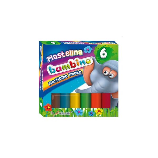 Plastelina Bambino to wysokiej jakości masa plastyczna. Jest elastyczna, nie brudzi rąk, nie przywiera do podłoża, łatwo się modeluje, pozwala na tworzenie prac metodą millefiori. Nie wysycha na powietrzu, przez co może być wykorzystywana wielokrotnie. Gama kolorów jest szeroka, barwy żywe, nasycone. Plastelina jest bezpieczna, ponieważ produkowane jest w zgodności z dyrektywą Parlamentu Europejskiego i Rady w sprawie bezpieczeństwa zabawek oraz rozporządzeniem Ministerstwa Gospodarki w sprawie zasadniczych wymagań dla zabawek. Opakowanie mix 6 kolorów.