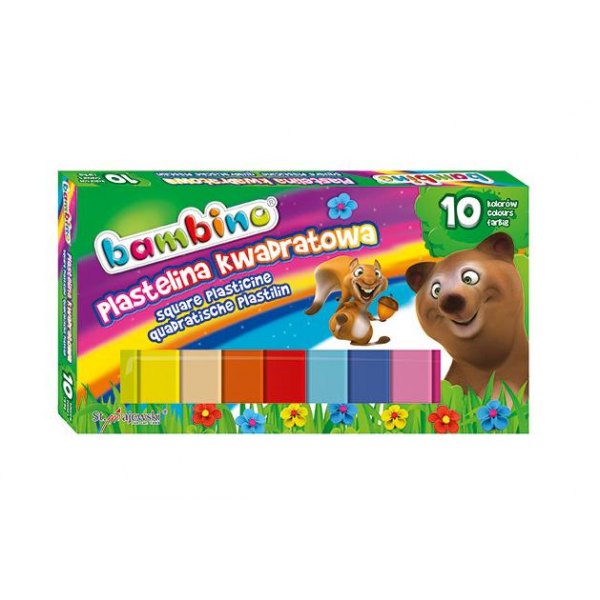Plastelina kwadratowa Bambino to wysokiej jakości masa plastyczna. Jest elastyczna, nie brudzi rąk, nie przywiera do podłoża, łatwo się modeluje, pozwala na tworzenie prac metodą millefiori. Nie wysycha na powietrzu, przez co może być wykorzystywana wielokrotnie. Gama kolorów jest szeroka, barwy żywe, nasycone. Plastelina jest bezpieczna, ponieważ produkowane jest w zgodności z dyrektywą Parlamentu Europejskiego i Rady w sprawie bezpieczeństwa zabawek oraz rozporządzeniem Ministerstwa Gospodarki w sprawie zasadniczych wymagań dla zabawek. Opakowanie mix 10 kolorów.