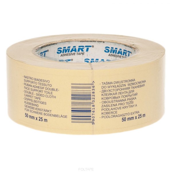 Taśma dwustronna SMART tkaninowa na bardzo mocnym kleju z zatopioną warstwą siateczki z włókna szklanego. Odporna na rozrywanie. Przeznaczona do podklejania wykładzin, wycieraczek, dywanów. Wymiary 50mmx25m.