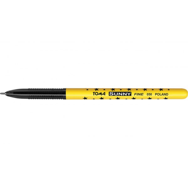 Długopis jednorazowy w plastikowej żółtej obudowie w gwiazdki w kolorze tuszu. Wentylowana nasadka, trwała kulka z węglików spiekanych 0,7mm. Szwajcarski wkład z tuszem gładko-piszącym do pisania po wszystkich rodzajach papieru, np. po odwrotnej stronie druków samokopiujących (faktur).Długość linii pisania 4000m. Kolor czarny.
