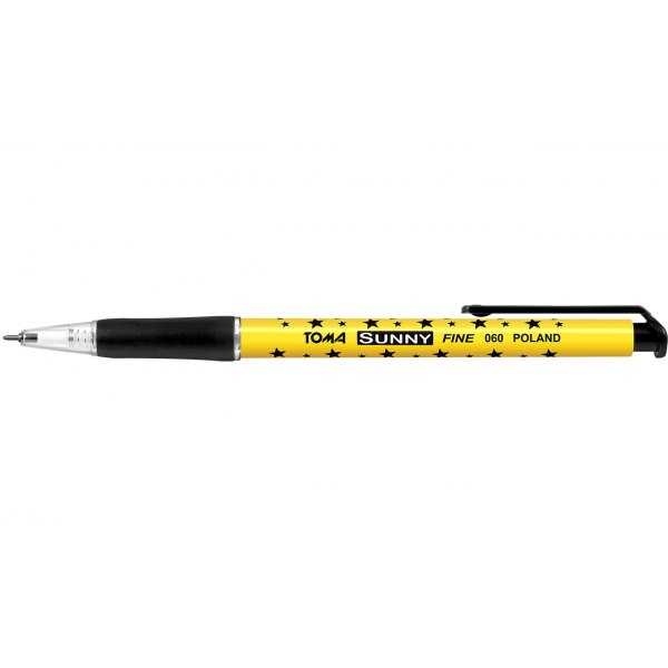 Długopis automatyczny w plastikowej żółtej obudowie w gwiazdki, klip i gumowy uchwyt w kolorze tuszu. Trwała kulka z węglików spiekanych 0,7mm. Szwajcarski wkład z tuszem gładko-piszącym do pisania po wszystkich rodzajach papieru, np. po odwrotnej stronie druków samokopiujących (faktur). Trwały mechnizm włączający, wygodny gumowy uchwyt, długość linii pisania 4000m. Kolor czarny.
